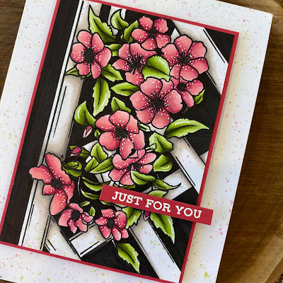 To start with I stamped the image with Altenew Permanent Black Crisp Dye Ink onto a panel of Express-It Blending card and then coloured the image with the markers (colours listed below). Once that was finished I decided to 'black out' the background using the black marker, which I was nervous about doing after spending hours colouring the image, but I found it really made the flowers and leaves pop!